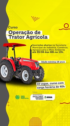 A Prefeitura Municipal de Arauá, por meio da Secretaria Municipal de Indústria, Comércio, Agropecuária e Meio Ambiente, em parceria com o sistema FAESE SENAR/SE, informa que estão abertas as inscrições para o curso de Operação de Trator Agrícola, até a próxima Sexta-feira, dia 05 de agosto.