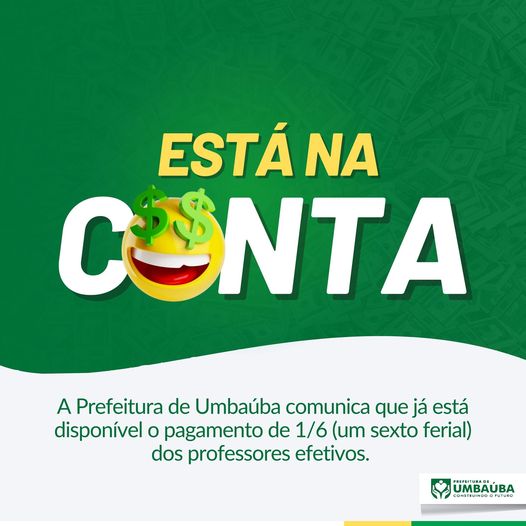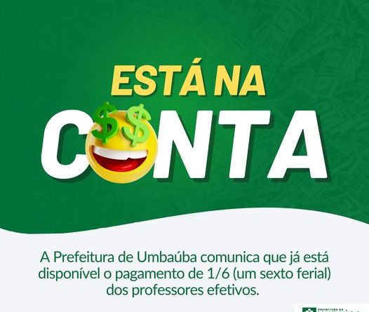 PREFEITURA DE UMBAUBA/SE INFORMA: JÁ ESTA NA CONTA 1/6 DAS FÉRIAS NA CONTA DE TODOS PROFESSORES A Prefeitura de Umbaúba informa que o pagamento de 1/6 (um sexto ferial) já está na conta de todos os professores efetivos! Prefeitura de Umbaúba Construindo o futuro Secom/Umbaúba