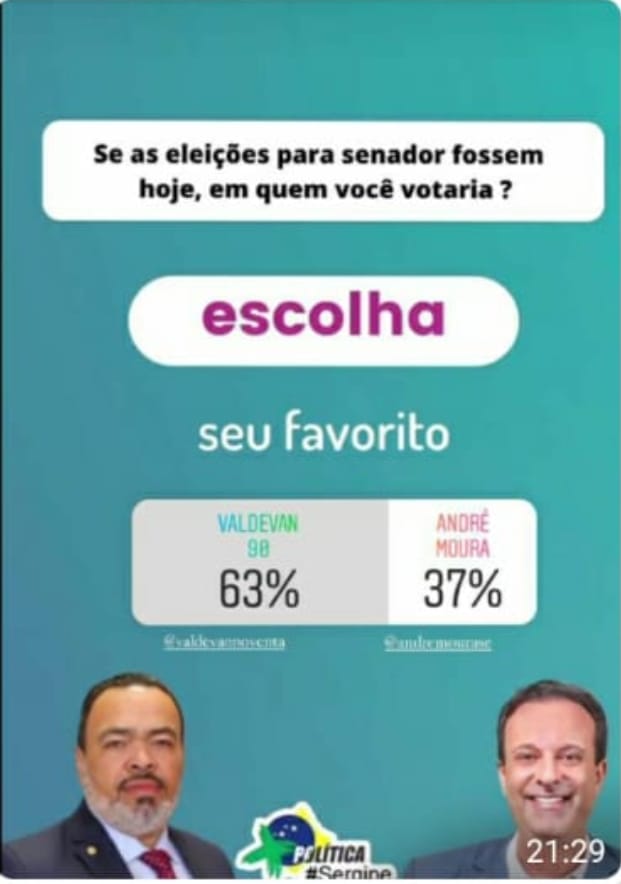 Em recente enquete para o senado, já apresenta seus primeiros resultados, como se vê, se as eleições fossem hoje, Valdevan 90 leva uma grande vantagem sobre seu mais ferrenho adversário, Andre Moura tendo apenas que ficar de olho na Delegada que vem correndo por fora e com muita chance, a moda de Delegado ainda pode prevalecer,e tanto que o Delegado Senador já anuncia