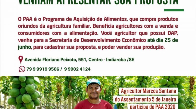 Social PREFEITURA DE DE INDIAROBA REALIZA O PAA 22 de junho de 2021 Chiquinho 0 comentários A Prefeitura de Indiaroba através da Secretaria Municipal de Desenvolvimento Econômico, realiza o PAA, uma ação de Aquisição de Alimentos oriundos da agricultura familiar, fique ligada (o) nas dicas e participe.