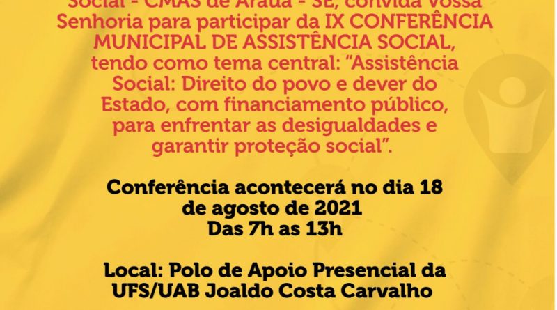 Entendendo a importância disso, o Conselho Municipal da Assistência Social em conjunto com a Prefeitura de Arauá, convidam a todos para a 9ª Conferência Municipal de Assistência Social, que terá como tema “Assistência Social: Direito do povo e Dever do Estado, com financiamento público, para enfrentar as desigualdades e garantir proteção social”.